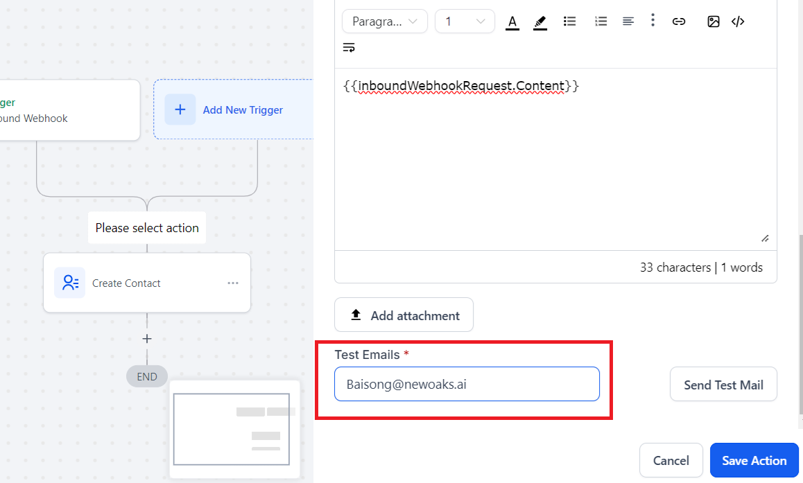 - Click “+” on the workflow builder panel to add an action, Find “Send Email” action and click “Send Email”